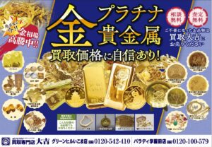 11月も金相場高騰の進捗推移に付き、通常インゴッドやアクセサリー、切れたネックレス、金歯などなどしっかり査定させて頂き、最大限お買取価格に反映させて頂きます。 その他、プラチナ、銀製品も金同様ここ10年前と比較しても高値で進捗しております。 是非、この機会にご不要な貴金属がございましたら買取専門店大吉パラディ学園前店までお持ち込み下さいね