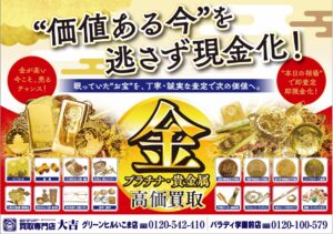 12月の金・プラチナ・貴金属高価買取強化月間チラシです。買取専門店大吉パラディ学園前店