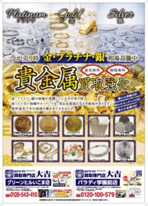 4月も金相場高値安定中です。買取専門店大吉パラディ学園前店のチラシです。